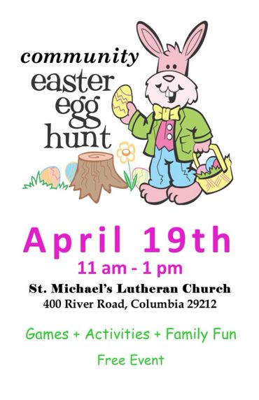 Saint Michael Lutheran Church hosts its annual Dutch Fork/Lake Murray Community Easter Egg Hunt on Saturday, April 19th from 11 am until 1 pm on the church’s historic grounds located at 400 River Road, Columbia, SC 29212. The church is before the Pine Island recreation area and just three minutes from the Lake Murray Dam.